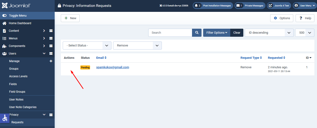 The email address will have received an email, once that email is read and the link clicked in it to confirm the request, then the admin can take actions. They will appear as icons there.