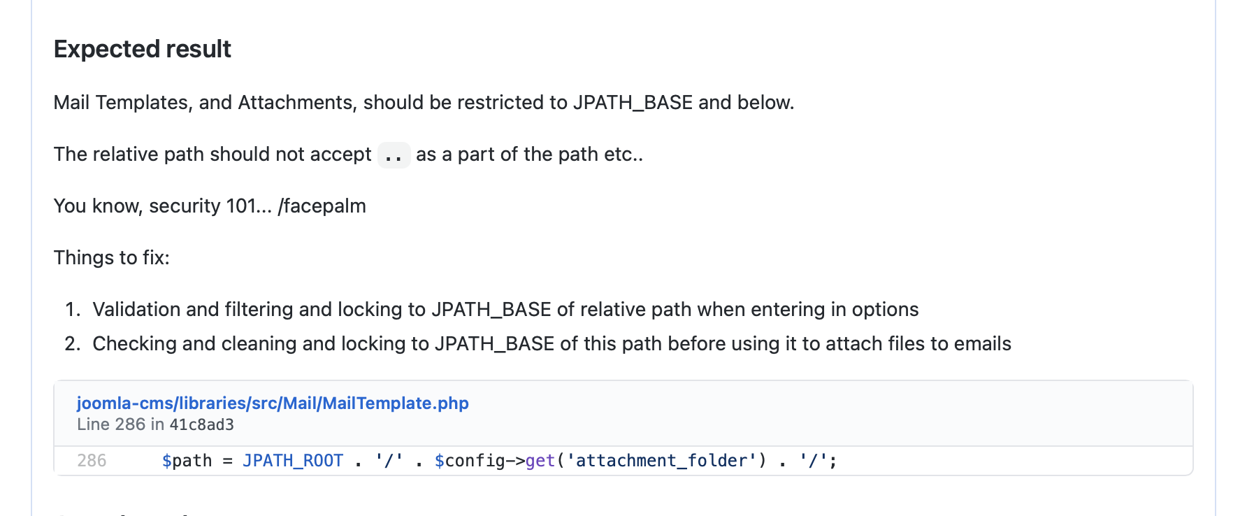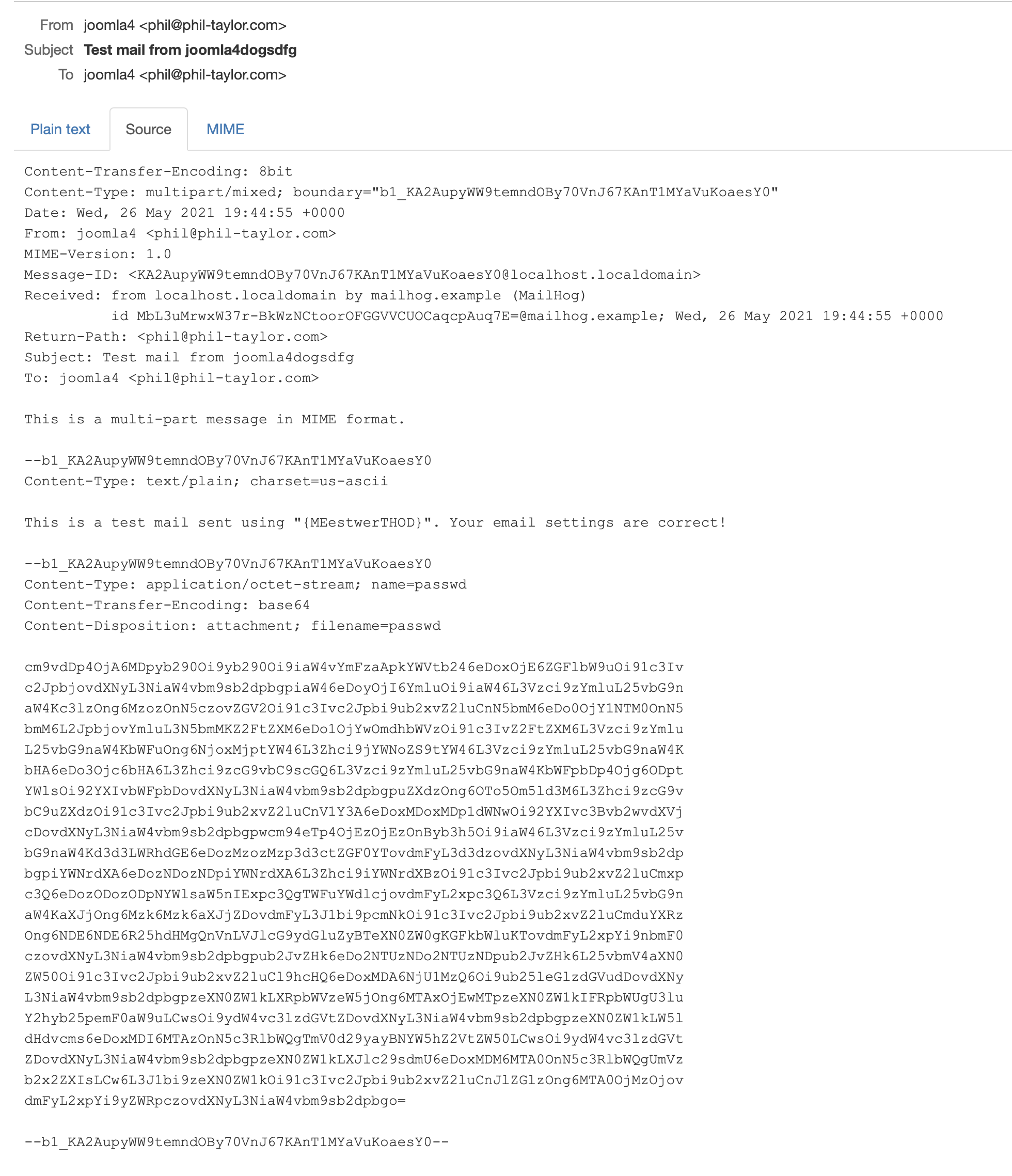 // and then the file is attached, even though its not in the attachment_folder. $attachment->file = JPATH_BASE/media/../../etc/passwd