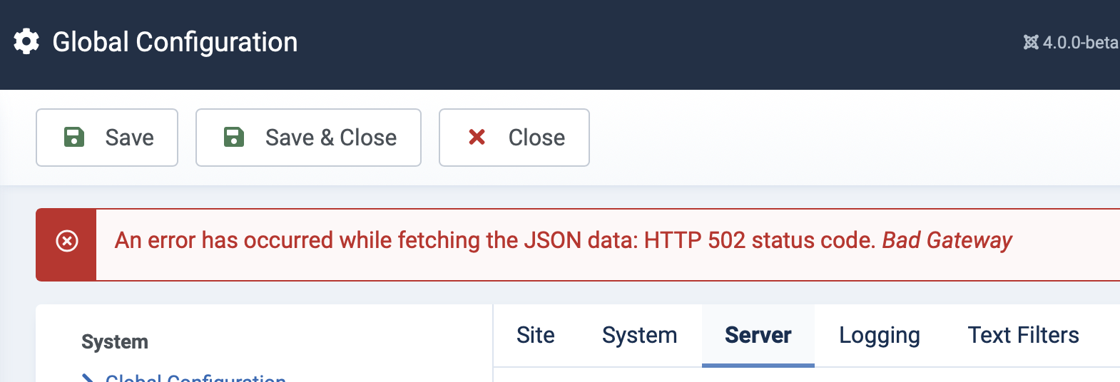 After doing 4 above, the image is obviously bad as ../../joomla_black.png would take you out of the joomla file system, this causes Path::check to throw an exception Joomla\CMS\Filesystem\Path::check() - Use of relative paths not permitted, which is not caught and handled (see 1), leading to a PHP fatal error (or on my set up, when sending the test email from Global Config, I get a An error has occurred while fetching the JSON data: HTTP 502 status code. Bad Gateway" error message shown on the page) #34263