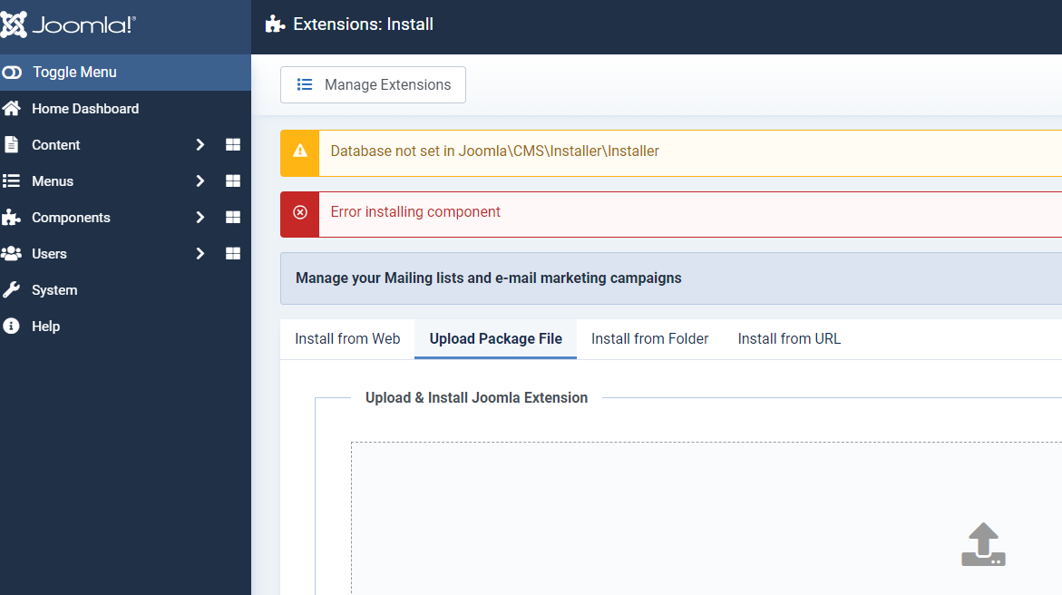 Installer::getDatabase() - Database not set in Joomla\CMS\Installer\Installer
