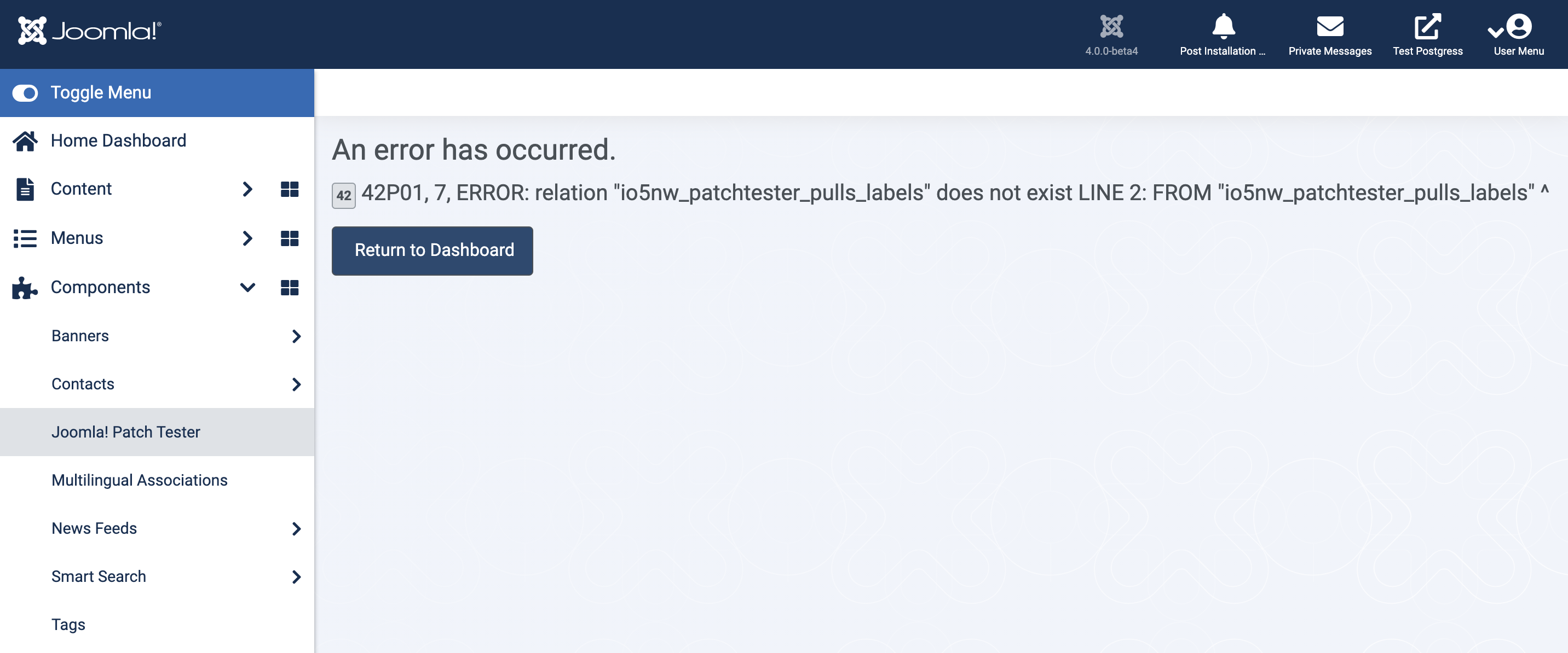 /administrator/index.php?option=com_patchtesterError: 42P01, 7, ERROR: relation "io5nw_patchtester_pulls_labels" does not exist LINE 2: FROM "io5nw_patchtester_pulls_labels" ^